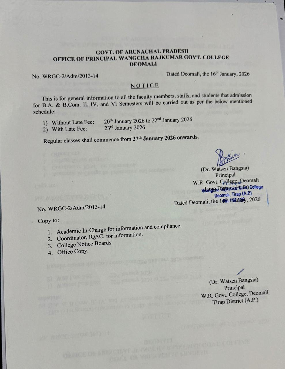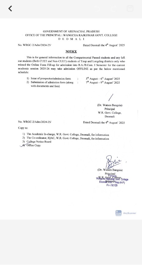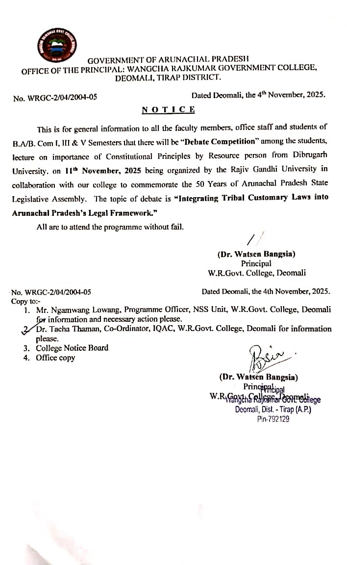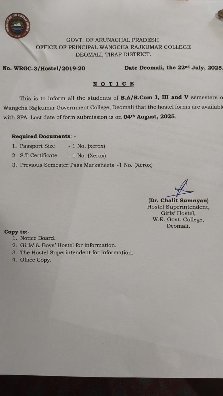 The college had a humble beginning in the year 1997 at Charju, Khonsa before being shifted to its present location. Historically, it has a record in pioneering higher education in Patkai region of Arunachal Pradesh and fulfills the long cherished desire of the people of this area. The college has been renamed, from the earlier “Tirap Government College” to existing “Wangcha Rajkumar Government College” by the Government in memory of late Wangcha Rajkumar, a renowned public leader; former Lok sabha M.P. and AICC member (vide GO No, ED/HE/1291/08 dated 12th June 2008).